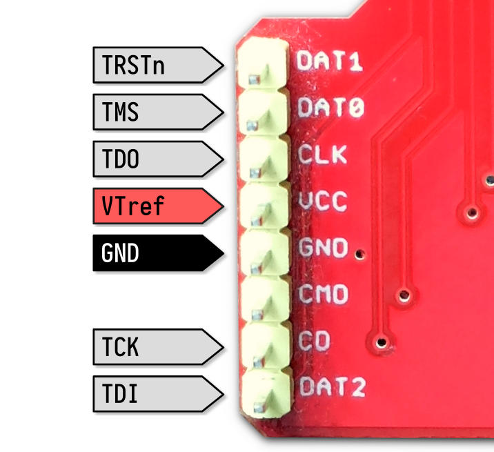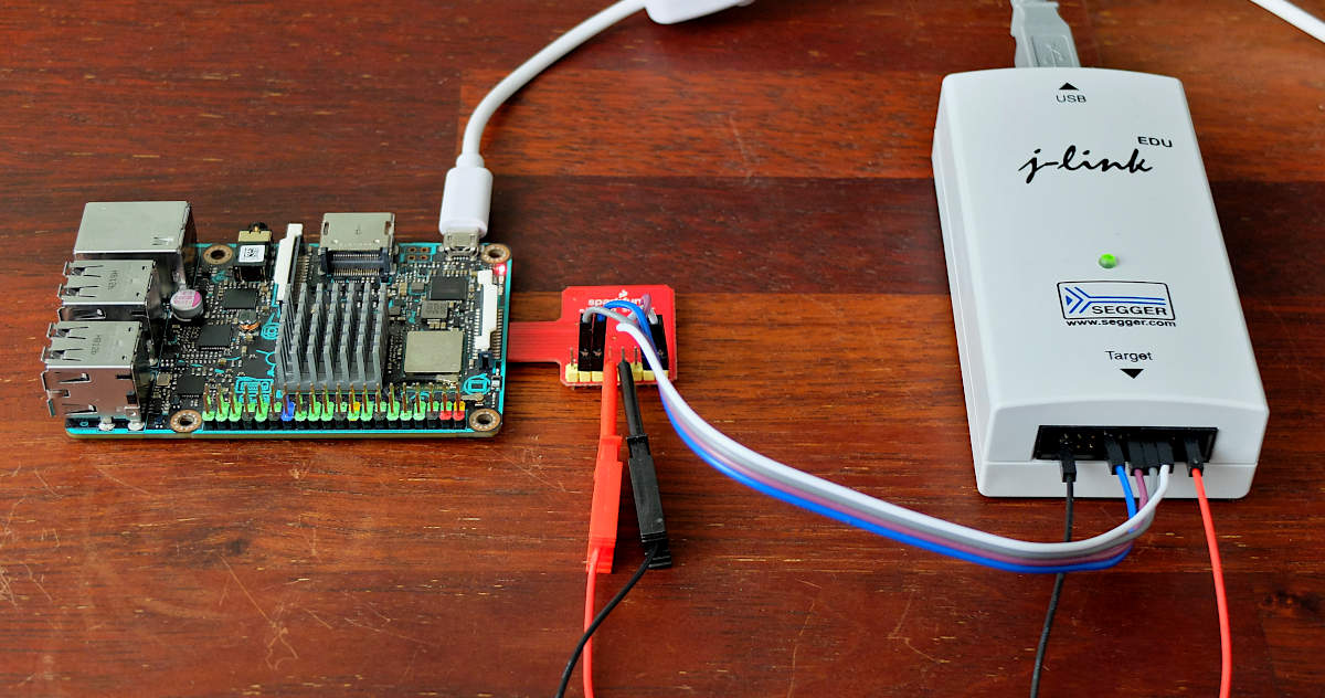 This can now be connected to your JTAG adapter. I’ve had good results with the J-Link, but I’m sure others can work fine as well. Please let me know at lukasz@THISDOMAIN if you have success with other adapters.