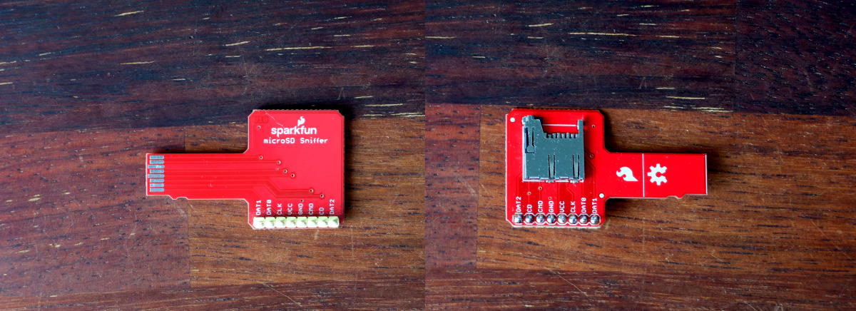 To break out the microSD/JTAG signals, I use the SparkFun microSD Sniffer. It’s a bit of a tight fit but once in it does the job nicely.
