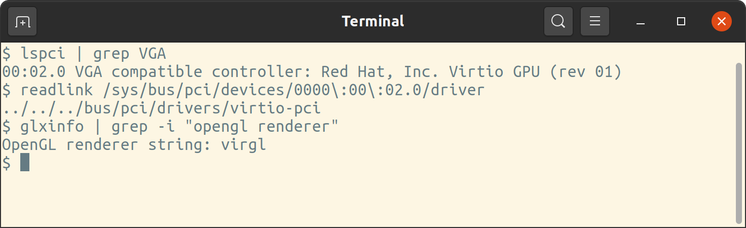 Combining -vga virtio with gl=on gives the most interesting results so far. We get all the benefits of virtio-gpu, now with accelerated OpenGL provided by the virgl Mesa driver. This is more para-virtualization in action, as virgl effectively uses the host GPU to accelerate 3D.